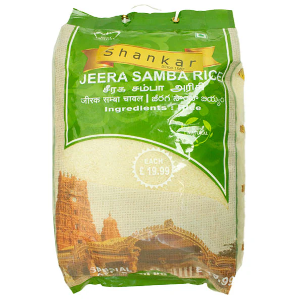 Shankar Jeera Samba Rice 5kg features small, aromatic grains with a unique texture and nutty flavor. Perfect for South Indian dishes like biryani and idli, it cooks light, fluffy, and full of authentic taste.